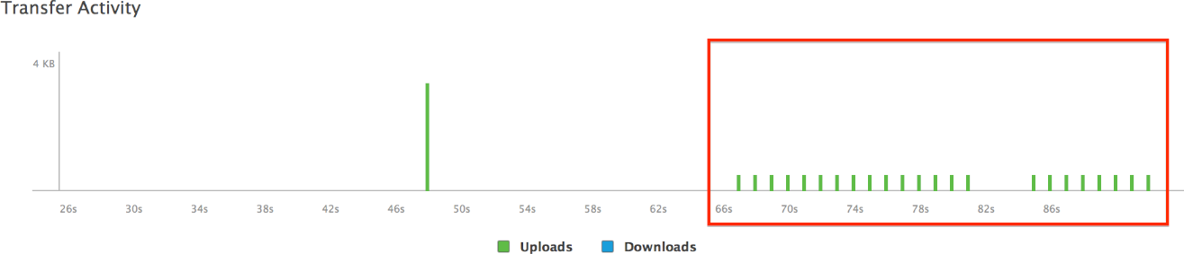 Базовые Данные создают журнал транзакций каждый раз, когда Вы сохраняете свой контекст управляемого объекта для обеспечения атомарности. Каждая транзакция загружается от контейнера повсеместности до iCloud в отдельном запросе, чтобы гарантировать, что каждый журнал транзакций сохраняется полностью в единственной работе. Когда Вы сохраняете слишком часто, Вы увеличиваете работу, которую другие коллеги выполняют для импорта изменений. Однако, когда Вы сохраняете слишком нечасто, большие журналы транзакций приводят к увеличенному использованию памяти. Например, на рисунке 5-4 ниже, большой кластер маленьких зеленых панелей указывает, что Ваше приложение сохраняет слишком часто. Можно читать больше об оптимизации в Методах наиболее успешной практики.