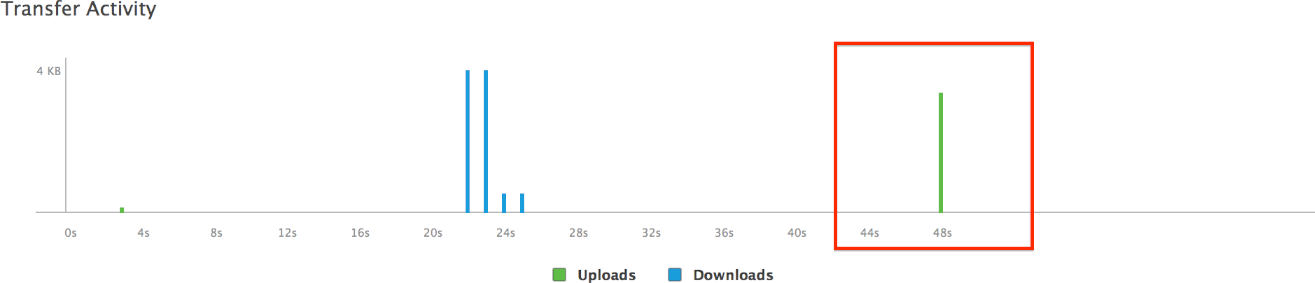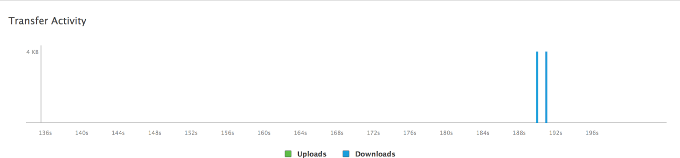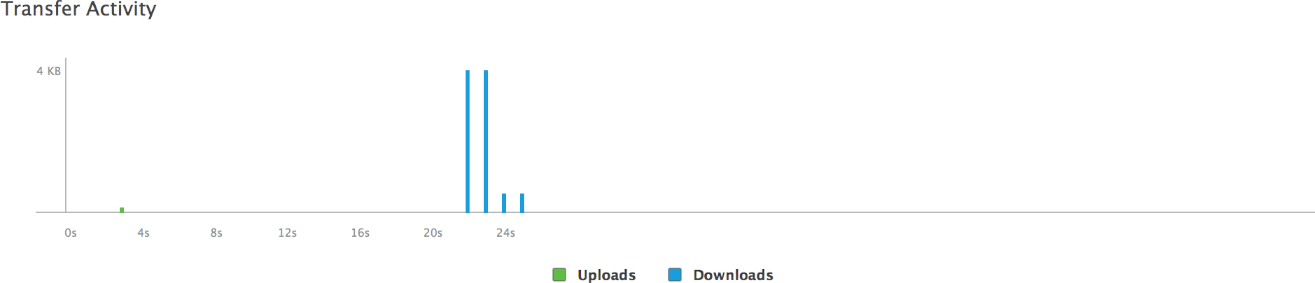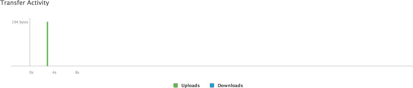 Отчет iCloud выводит на экран использование пропускной способности iCloud в течение долгого времени для Вашего приложения. Зеленые панели указывают, что журналы транзакций или другие разные запросы были отправлены от в настоящее время присоединяемой коллеги в iCloud, и синие панели указывают, что журналы транзакций и запросы были получены от iCloud. Вы используете временную шкалу Действия Передачи для: