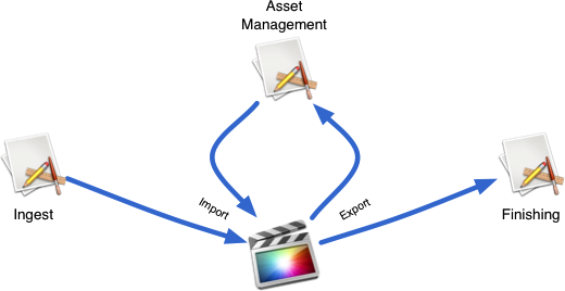 Final Cut Pro X работает с другими приложениями в различных потоках операций. В некоторых случаях другое приложение поглощает видеозапись от внешнего устройства для редактирования в Final Cut Pro X. В других случаях Final Cut Pro X, редактируя результаты передается другому приложению для составления композита, цветной классификации или окончания. Когда система управления активами управляет активами носителей, используемыми Final Cut Pro X, существуют также случаи.