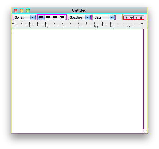 Если Вы устанавливаете NSShowAllViews предпочтение к ДА, AppKit нарисует основы вокруг каждого из представлений в окне. Рисунок 5 показывает, как стандартное окно TextEdit смотрит с NSShowAllViews включенный.