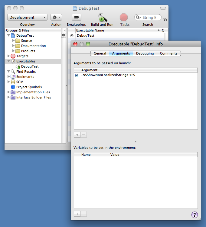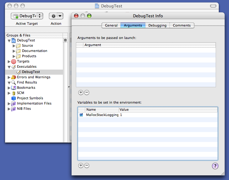 Во многих случаях можно включить средство отладки путем установки определенной переменной окружения. Можно сделать это использование исполнимого инспектора в XCode. Рисунок 1 показывает пример этого.