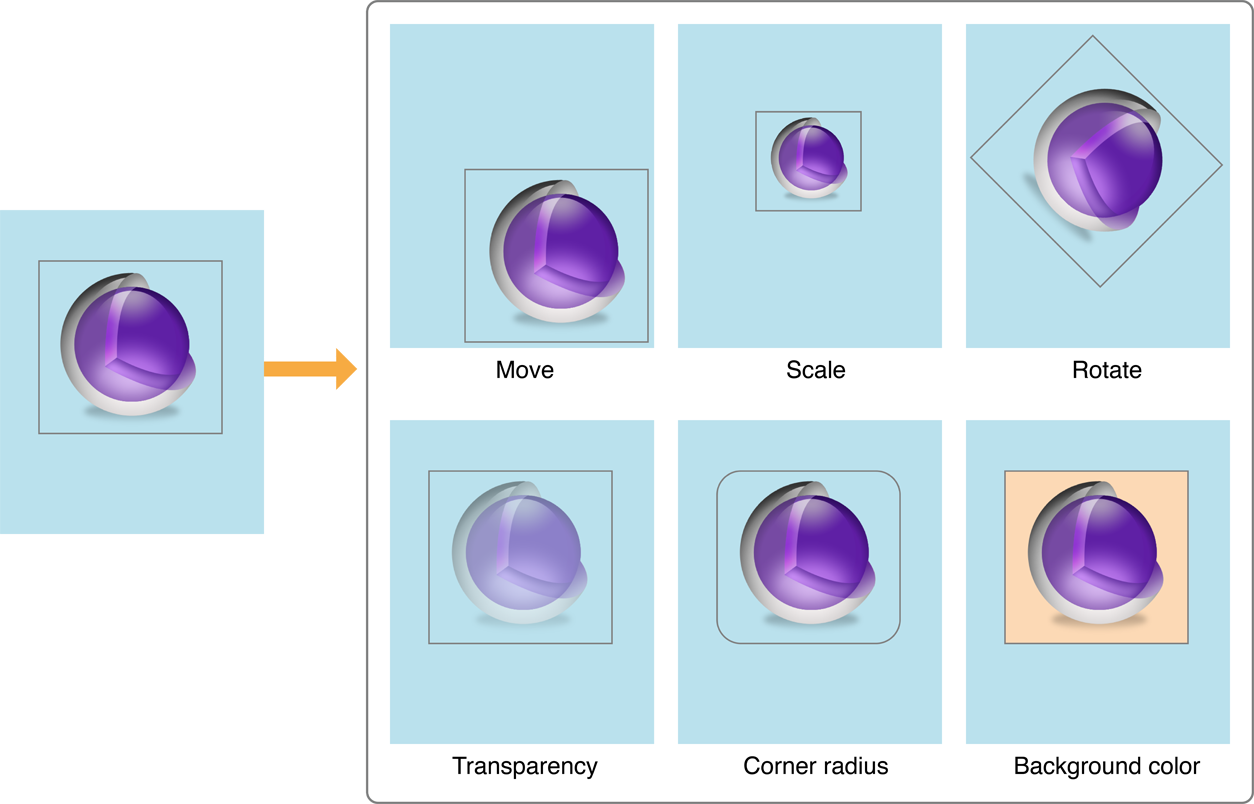 Данные и информация состояния расположенного на слое объекта разъединяются от визуального представления содержания того уровня на экране. Это разъединение дает Базовую Анимацию, которую способ вмешаться сам и анимировать изменение от старого состояния оценивает новым значениям состояния. Например, изменение свойства позиции уровня заставляет Базовую Анимацию перемещать уровень от своей текущей позиции до недавно указанной позиции. Подобные изменения в других свойствах вызывают надлежащие анимации. Рисунок 1-2 иллюстрирует несколько типов анимаций, которые можно выполнить на уровнях. Для списка свойств слоя, инициировавших анимации, см. Свойства Animatable.