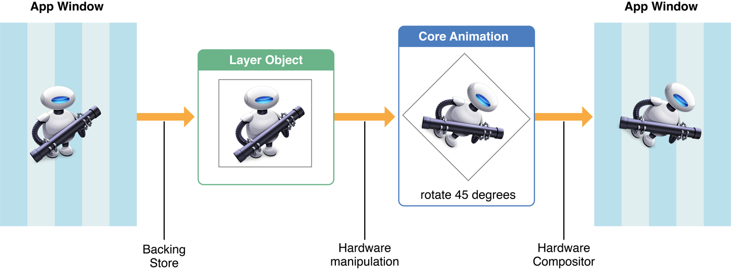 Поскольку это управляет статическим битовым массивом, основанное на уровне получение отличается значительно от более традиционных основанных на представлении методов получения. С основанным на представлении получением изменения в самом представлении часто приводят к вызову к представлению drawRect: метод для перерисовки содержания с помощью новых параметров. Но получение таким образом является дорогим, потому что оно сделано с помощью CPU на основном потоке. Базовая Анимация избегает этого расхода, когда это возможно, путем управления кэшированным растровым изображением в аппаратных средствах для достижения тех же или подобных эффектов.