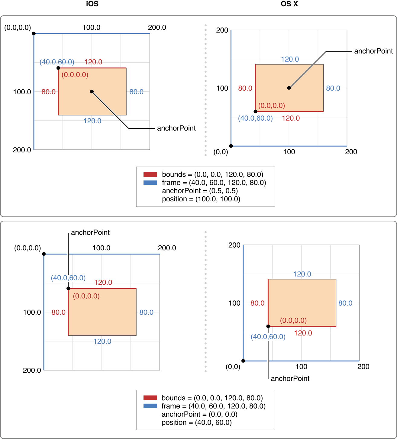 Ориентация уровня bounds и frame прямоугольники всегда соответствуют ориентацию по умолчанию базовой платформы. Рисунок 1-3 показывает ориентации по умолчанию прямоугольника границ и на iOS и на OS X. В iOS источник прямоугольника границ находится в верхнем левом углу уровня по умолчанию, и в OS X это находится в нижнем левом углу. При совместном использовании Базового кода Анимации между iOS и версиями OS X приложения необходимо принять такие различия во внимание.
