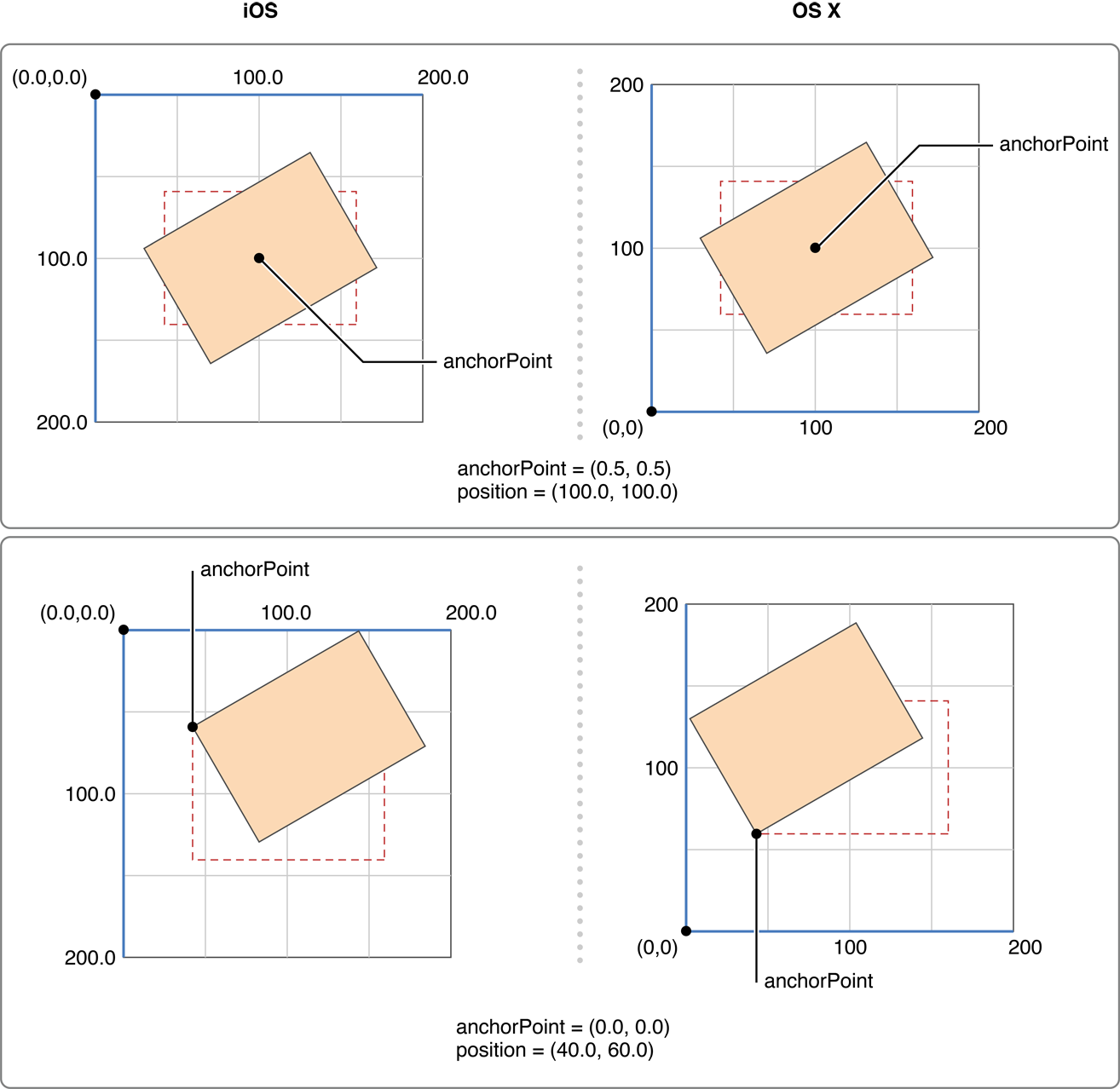 Геометрия имела отношение, манипуляции уровнем происходят относительно точки привязки того уровня, которая можно получить доступ к использованию уровня anchorPoint свойство. Влияние точки привязки является самым примечательным при управлении position или transform свойства уровня. Свойство позиции всегда указывается относительно точки привязки уровня, и любые трансформации, Вы применяетесь к уровню, происходят относительно точки привязки также.