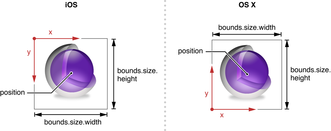 Среди наиболее популярных способов использования основанных на точке координат должен указать размер и позицию уровня, который Вы делаете использование уровня bounds и position свойства. bounds определяет систему координат самого уровня и охватывает размер уровня на экране. position свойство определяет расположение уровня относительно системы координат его родителя. Несмотря на то, что уровни имеют a frame свойство, то свойство фактически получено из значений в bounds и position свойства и используются менее часто.