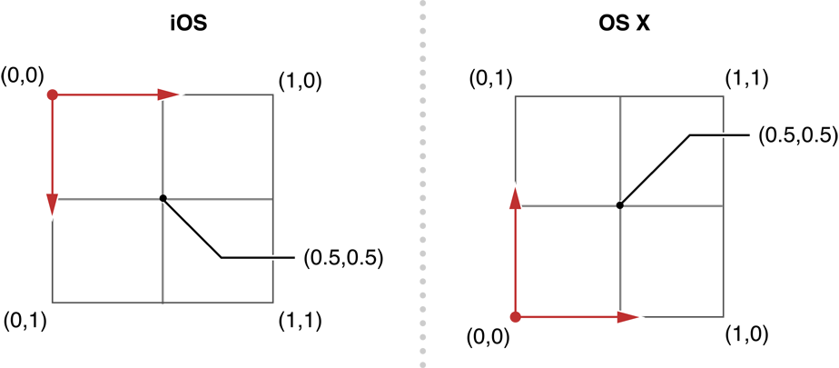 Точка привязки является одним из нескольких свойств, что Вы указываете использование системы координат модуля. Базовая Анимация использует координаты модуля для представления свойств, значения которых могли бы измениться, когда изменяется размер уровня. Можно думать о координатах модуля как об указании процента общего возможного значения. Каждая координата в координатном пространстве модуля имеет диапазон 0.0 к 1.0. Например, вдоль оси X, левый край в координате 0.0 и правый край в координате 1.0. Вдоль оси y ориентация модуля координирует изменения значений в зависимости от платформы, как показано на рисунке 1-4.