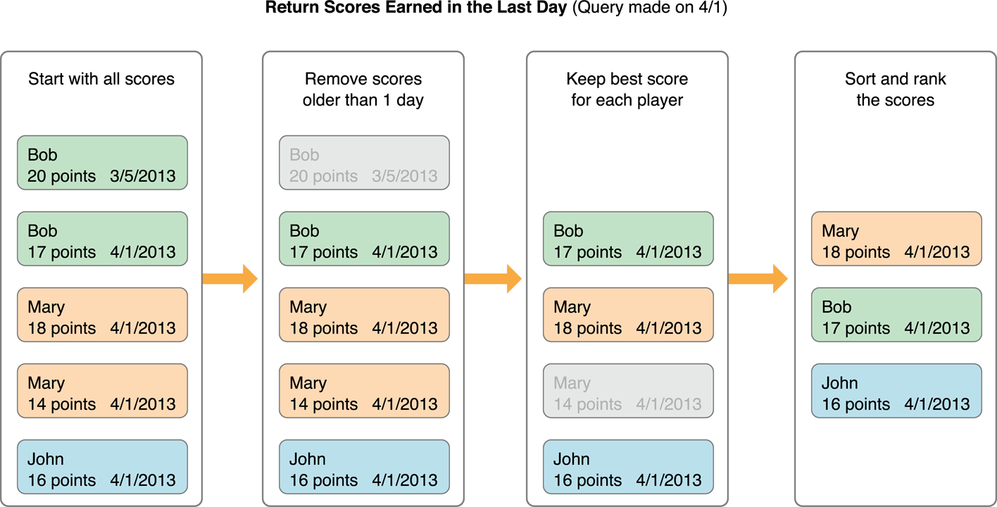 Рисунок 4-1 показывает пример одного возможного поиска. Код, выполняющий этот поиск, предоставлен позже в Перечислении 4-11. В этом примере, очки больше чем старый день проигнорированы. Затем от остающегося набора очков мы видим, что у Боба есть два очков, поэтому только его лучший счет сохранен. Наконец, очки сортированы и оценены. Выбранный диапазон тогда возвращается к игре.