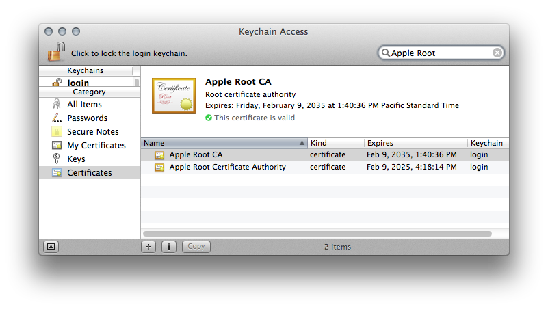 1. Загрузка и установка оба корневых центра сертификации Apple здесь: Корневой Центр сертификации Apple.